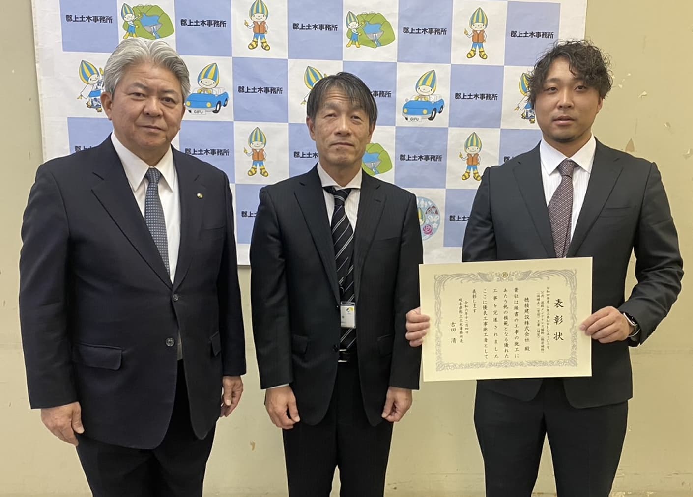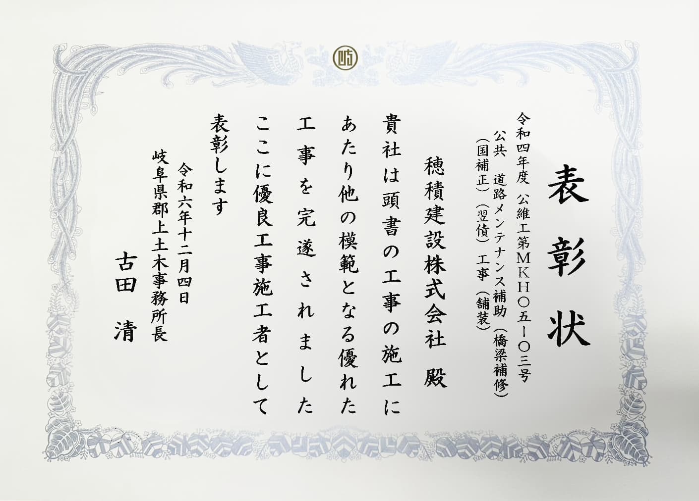 令和4年度から施工した「公共 道路メンテナンス補助(橋梁補修) (国補正) (翌債) 工事(舗装)」において『令和6年度岐阜県優良工事施工者』を受賞しました。